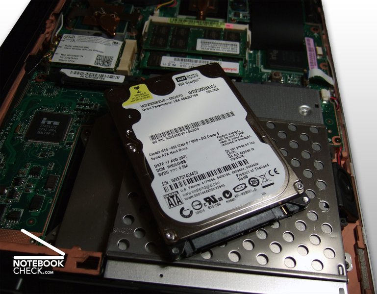 Die Konfiguration unseres Testnotebooks hat Alb mit einem 2,2 GHz schnellen Core 2 Duo Prozessor T7500 von Intel, insgesamt drei GByte DDR2-667 Arbeitsspeicher und einer 250 GByte fassenden Festplatte von Western Digital recht üppig ausgewählt. Zusätzlich kann das Testgerät auf Intels Turbo Memory Technologie (Codename: Robson) zurückgreifen, welche mithilfe eines ein Gigabyte großen Zwischenspeichers weitere Vorteile in Bezug auf die Geschwindigkeit und Akkulaufzeit bringen soll.