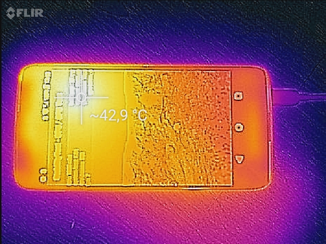 Der obere Teil des Smartphones wird unter Last recht warm. Es ist zwar nicht unangenehm, doch bis zu 42 °C merkt man vor allem beim Spielen schon. Die hohen Temperaturen sind auch ein Ergebnis der konstanten Leistung des SoCs, denn wir können mit dem GFXBench Akku-Test keine Leistungsreduzierung bei andauernder Belastung feststellen.