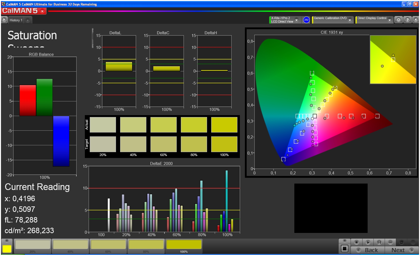 Die Messung mit dem Kolorimeter und der Software CalMan ergeben ein unterschiedliches Bild: Einerseits sieht man den deutlichen Blaustich, den viele Bildschirme aufweisen und so sind auch viele blaue Farbtöne zu weit vom Optimalwert des Referenzfarbraums entfernt. Ansonsten aber sind beispielweise die Graustufen relativ nah am Optimalwert, lediglich sehr helle Töne weichen etwas zu stark ab.