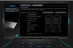 Als zentrale Anlaufstelle dient dabei das Command Center, welches in vier Menüs unterteilt ist. Angefangen mit AlienFX, das dem Nutzer bei der Individualisierung der verschiedenen Beleuchtungszonen hilft. Weiter geht es mit AlienFusion (Energiesparpläne) und AlienTactX (Konfiguration der Makro-Tasten). Abgerundet wird das Paket von AlienAdrenaline, mit dem sich der Status des Graphics Amplifiers überprüfen lässt. Eine manuelle Lüftersteuerung oder ein Overclocking-Menü für CPU und GPU sucht man vergebens. Andere Notebooks-Firmen (z. B. MSI, Asus & Clevo) liefern in dieser Beziehung oft mehr.