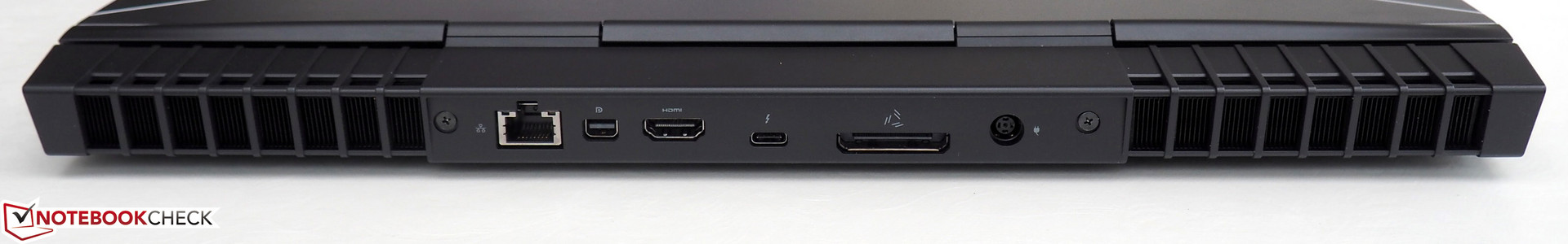 Wenngleich zwei USB 3.0 Typ A Ports für Gaming-Verhältnisse recht mager sind, wird die Anschlussausstattung dem Kaufpreis gerecht. Zusammen mit dem USB 3.0 Typ C Port (links) und dem Thunderbolt-3-Port (hinten), der auch USB 3.1 und DisplayPort beherrscht, kann man jede Menge Peripherie anstecken. Ähnlich sieht es mit externen Monitoren aus, welche an den Mini-DisplayPort oder den HDMI-2.0-Ausgang wandern. Der RJ45-Port und der Stromstecker befinden sich ebenfalls an der Rückseite. Das Noble Lock (Pendant zum Kensington Lock) und die beiden Audio-Anschlüsse (3,5 mm Klinke für Headset und Mikrofon) hat Dell auf der linken Seite untergebracht.