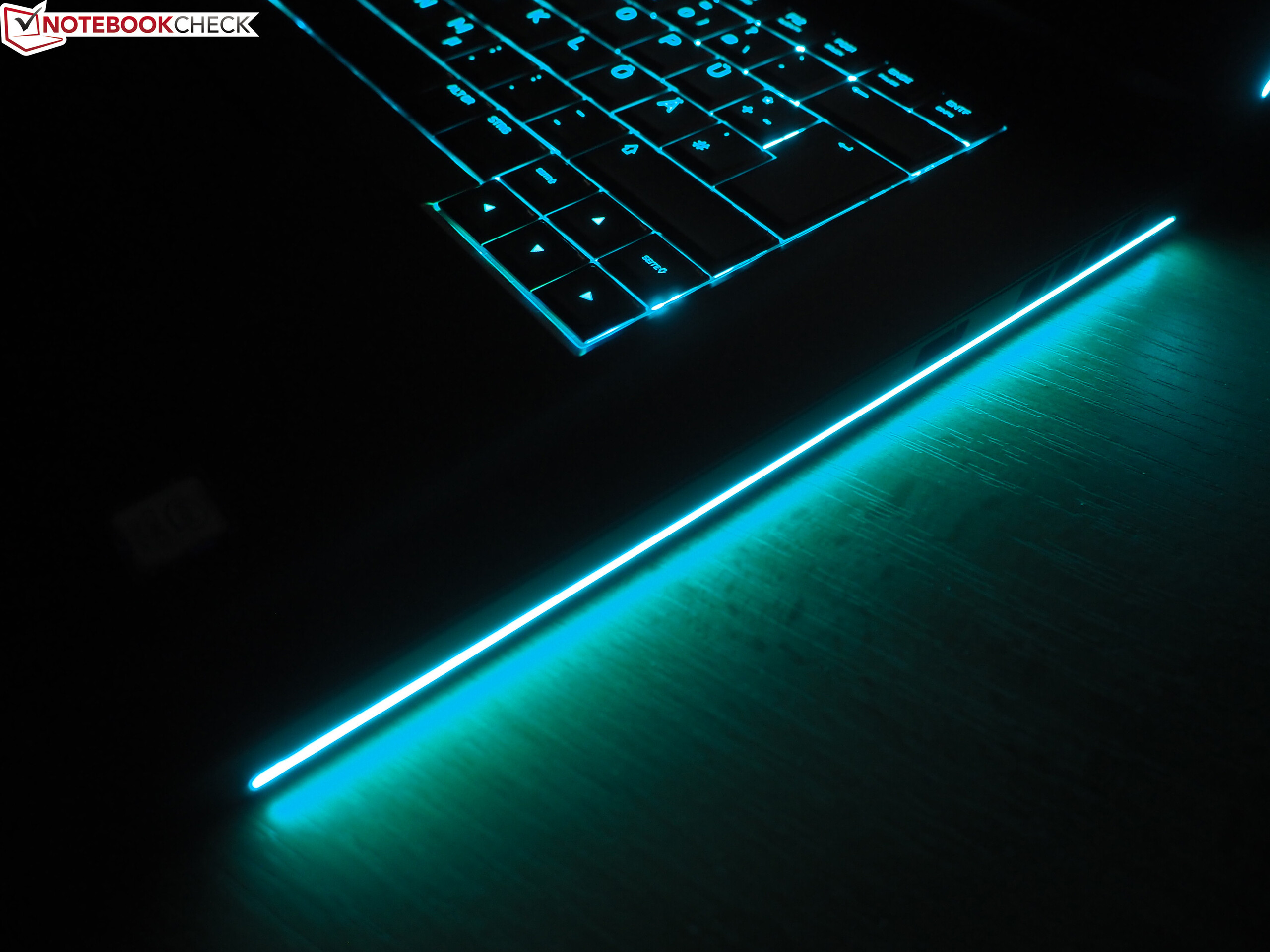 Ansonsten würden wir das Design als gelungen bezeichnen. Trotz der Tatsache, dass manche Elemente recht verspielt sind und ganz klar auf ein Gaming-Produkt hindeuten, wirkt der Gesamtauftritt sehr edel und hochwertig. Auf eines der wichtigsten Markenzeichen, die umfangreiche Beleuchtung, wurde natürlich nicht verzichtet. Im ersten Moment mögen beleuchtete Seitenflächen (siehe Fotos) wie ein »Poser-Gimmick« erscheinen, allerdings hat dieses Feature im Dunkeln durchaus seine Vorteile (bessere Sichtbarkeit der Ports und der Maus). Apropos Maus: Um Nutzern die Eingabe zu erleichtern, ist nicht nur die Tastatur, sondern auch das Touchpad beleuchtet.