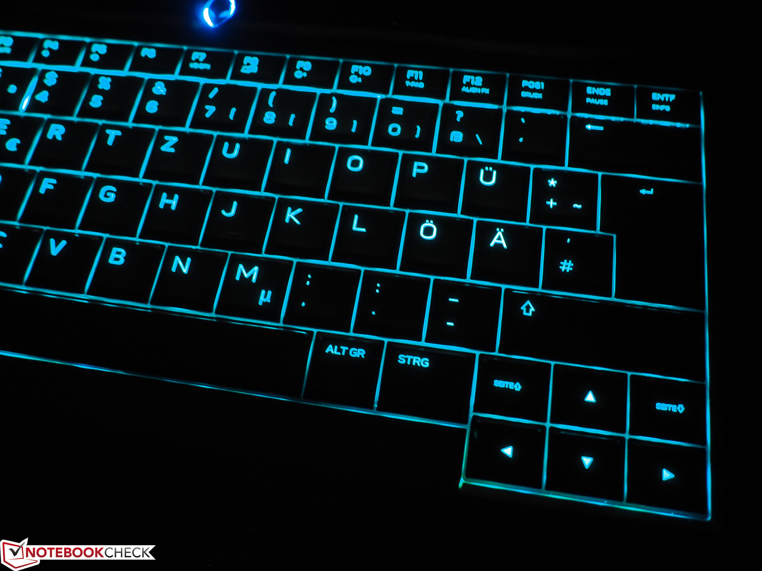 Mit Ausnahme des fehlenden Nummernblocks, der durchaus Platz gehabt hätte, lässt Dell bei der Tastatur nichts anbrennen. Die matt-schwarzen, dicht aneinandergereihten und dezent gummiert wirkenden Tasten (kein Chiclet-Design) zeigen das von Alienware-Notebooks bekannte Tippverhalten, das sich recht weich, aber trotzdem präzise und zuverlässig anfühlt. Druckpunkt und Anschlag geben keinen Anlass zur Kritik. Lediglich ein paar der breiteren Tasten (allen voran Backspace) bieten ein etwas seltsames Feedback. Bezüglich der Größe können wir Dell nichts vorwerfen. So kommen Buchstaben und Zahlen auf durchschnittlich 18 x 18 Millimeter. Selbst die abgesetzten Pfeiltasten sind halbwegs ordentlich dimensioniert. Das deutsche Layout können Sie anhand der unteren Bilder begutachten.