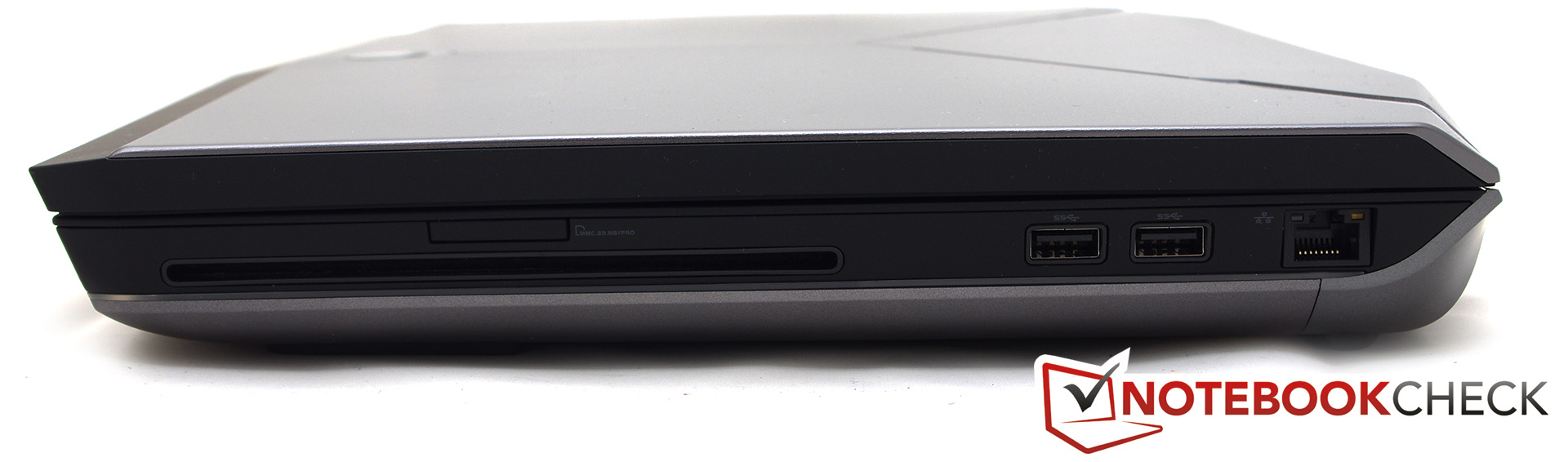 Die rechte Seite wird von einem Slot-in DVD-Brenner belegt, der uns im Test so manchen Schrecken einjagte. Im Idle gab er gerne ein lautes und nervendes Knarzen von sich, auch wenn sich keine DVD im Laufwerk befand. Weiterhin finden wir rechts zwei weitere USB 3.0 Ports sowie einen Gigabit-LAN-Port. Die Anschlussverteilung dürfte besonders Rechtshändern gefallen, da USB-Stecker oder Mausstecker keine Behinderung darstellen. Linkshänder benötigen hingegen etwas mehr Platz, da sich die Anschlüsse sehr weit im vorderen Bereich des Notebooks befinden.