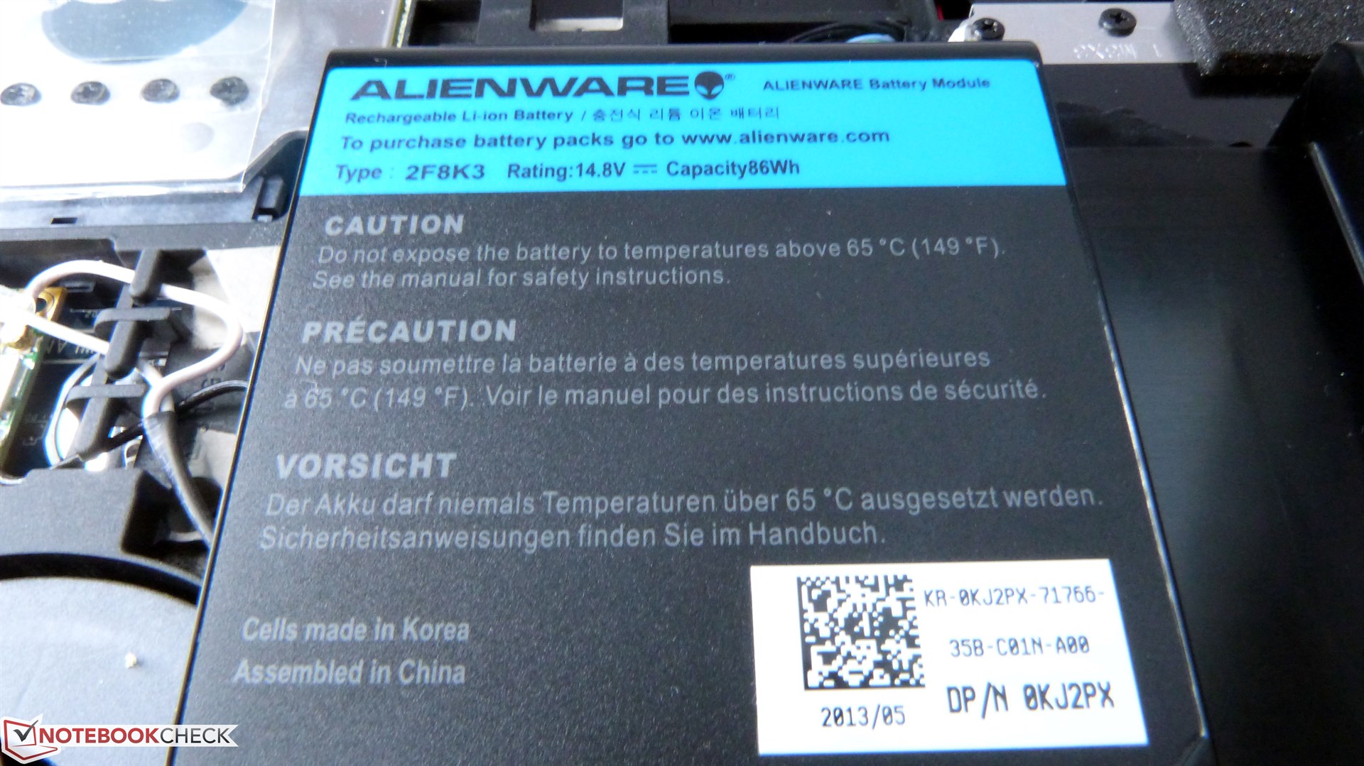 Angesichts von 86 Wattstunden verdient der Akku das Prädikat "potent". Der Energielieferant sorgt im Idle dank guter Energiesparoptionen für eine Laufzeit von über vier Stunden. Da es sich beim Alienware 17 nicht um ein Ultrabook mit Anspruch auf ganze Arbeitstage ohne Netzstrom handelt, ist dieser Wert mehr als vorzeigbar.