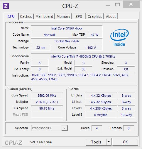 Getaktet wird der i7-4800MQ mit 2,7 Gigahertz, was auf den ersten Blick recht konservativ erscheinen mag. Dank Turbofunktion klettert der Prozessor bei Bedarf jedoch auf bis zu 3,7 Gigahertz - je mehr Kerne im Einsatz sind, desto geringer der maximale Takt. So wirkt der Prozessor im Alltag nicht langsamer als die Desktop-Pendants mit ihren 77 Watt TDP. Das Notebook-Modell nimmt nur 47 Watt auf, inklusive der integrierten HD-4600-GPU.