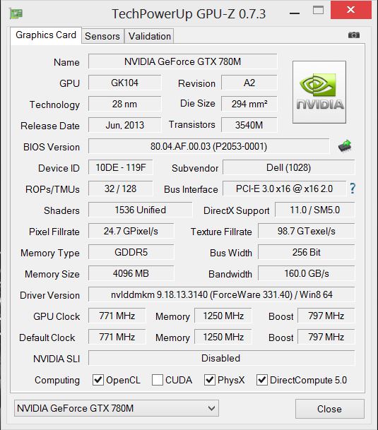 Im 3D-Betrieb taktet die GTX 780M standardmäßig mit 823 MHz, kann dank der GPU-Boost-Funktion jedoch bis zu 849 Megahertz erreichen. Unter Volllast (extrem rechenintensive Anwendungen wie Furmark) sinkt der Takt allerdings auf 666 Megahertz.