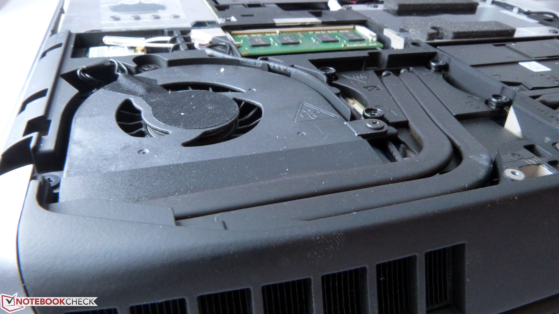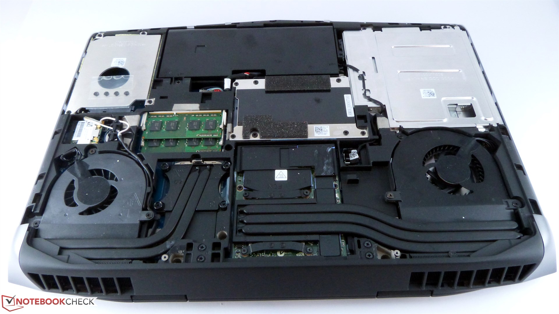 Derart bequem an das Innenleben gelangt, bietet sich der Blick auf eine äußerst wartungsfreundliche Hardware. So sind beispielsweise die beiden Lüfter (CPU und GPU getrennt) erreichbar und dank gesteckter Verbindungen sogar austauschbar. Ein freier Festplattenschacht wartet auf den Einbau eines 2,5-Zoll-Laufwerks, der zweite Slot in der Mitte des Notebooks ist bereits belegt. Selbst das Blu-ray-Laufwerk lässt sich mit wenigen Handgriffen demontieren, gleiches gilt für zwei der vier Speicherbänke und das WLAN-Modul.