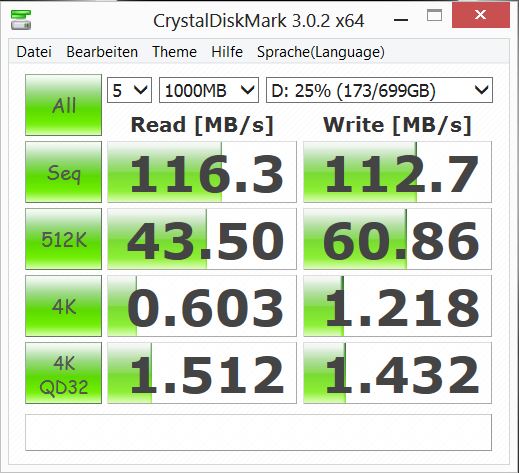 Dabei ist selbst die mit 7.200 U/Min laufende HDD kein lahmer Vertreter ihrer Zunft. Mit 750 Gigabyte Kapazität eignet sich die Western Digital Black sowohl als Datengrab für Musik, Filme und Fotos als auch für die Installation von Spielen. Die Geschwindigkeit sieht mit maximal 110 MByte/Sek und durchschnittlich 87,4 MByte/Sek (HDTune) recht gut für eine klassische Festplatte aus.