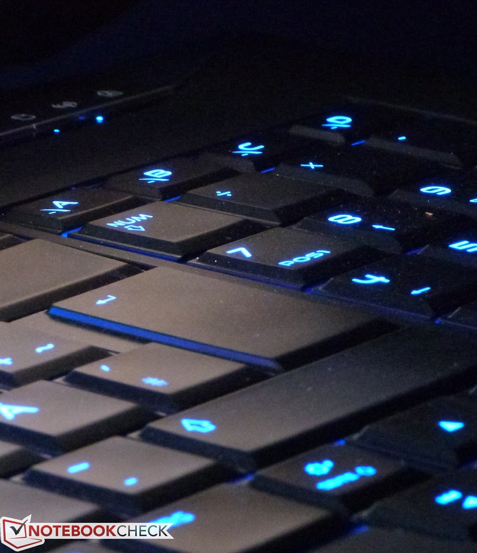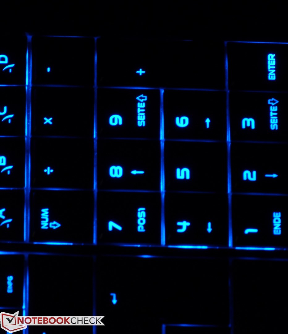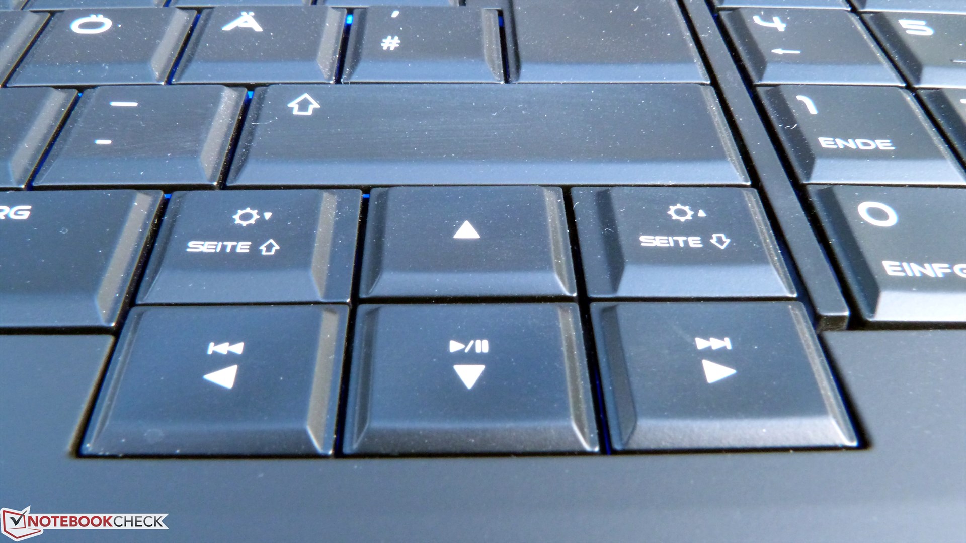 Das Feedback beim Betätigen der Tasten ist gut, was nicht zuletzt an der ordentlichen Tastengröße liegt. Über dem Nummernblock finden sich noch vier Makrotasten, die per Software gleich dreifach belegt werden können. Per Fn-Tastenkombination lassen sich auf der F-Reihe abgelegte Zusatzfunktionen nutzen: So kann man unter anderem die Helligkeit und die Lautstärke regeln, das WLAN umstellen oder die jeweils aktive GPU für den Akkumodus wählen.