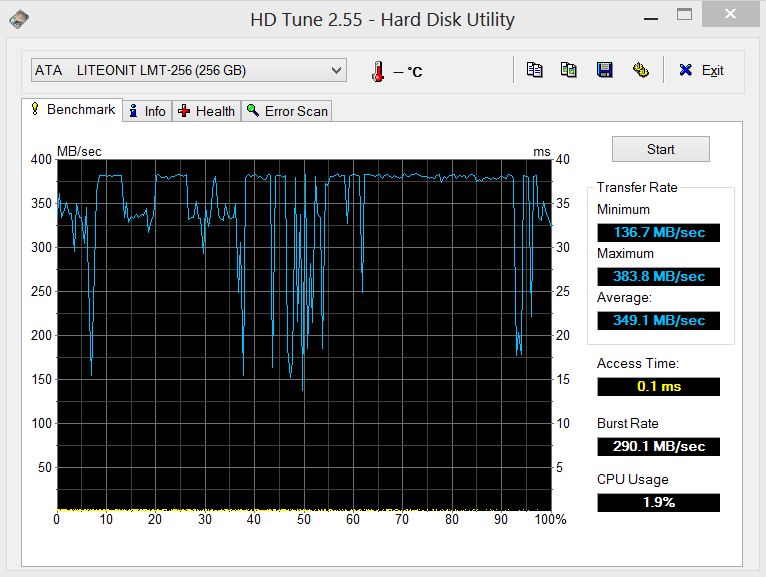 Dem gegenüber stehen die Ergebnisse der von Liteon gefertigten SSD, deren Kapazität 256 Gigabyte beträgt (LMT-256M6M). Mit rund 350 MByte pro Sekunde überträgt das Flash-Laufwerk ein Vielfaches an Daten gleichzeitig, besonders stark auf den Komfortgewinn wirkt sich die geringe Zugriffszeit von 0,1 Millisekunden aus (HDD @ 20 ms).