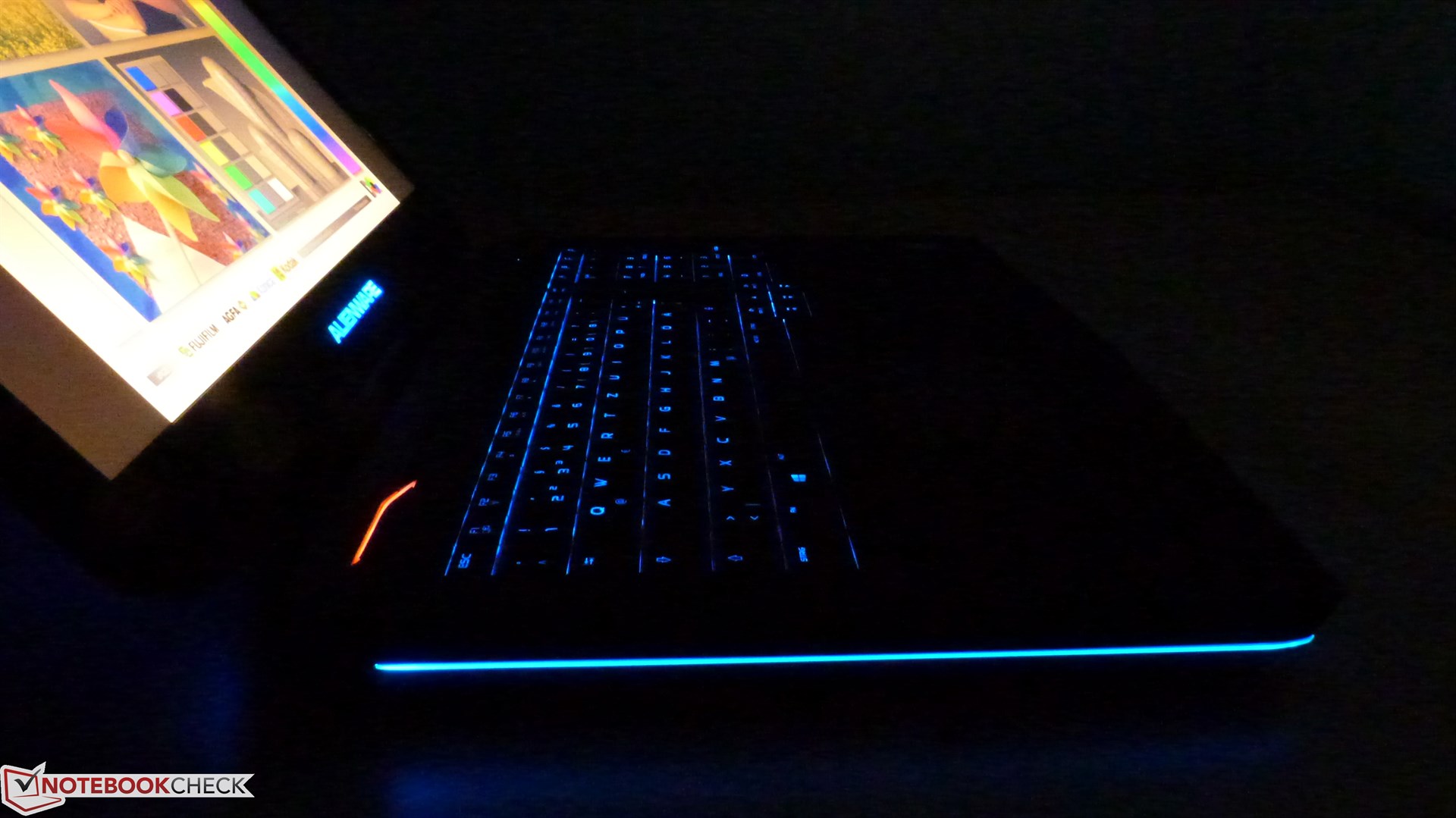 Mit Licht hat Alienware definitiv nicht gespart. Der Deckel, der Gehäuserand, die Tastatur und das Touchpad, ja sogar der Stromstecker - alles leuchtet auf Wunsch in frei wählbaren Farben. Wer mag, kann einzelne Lichtelemente sogar beim Eintreffen von Mails pulsieren lassen.