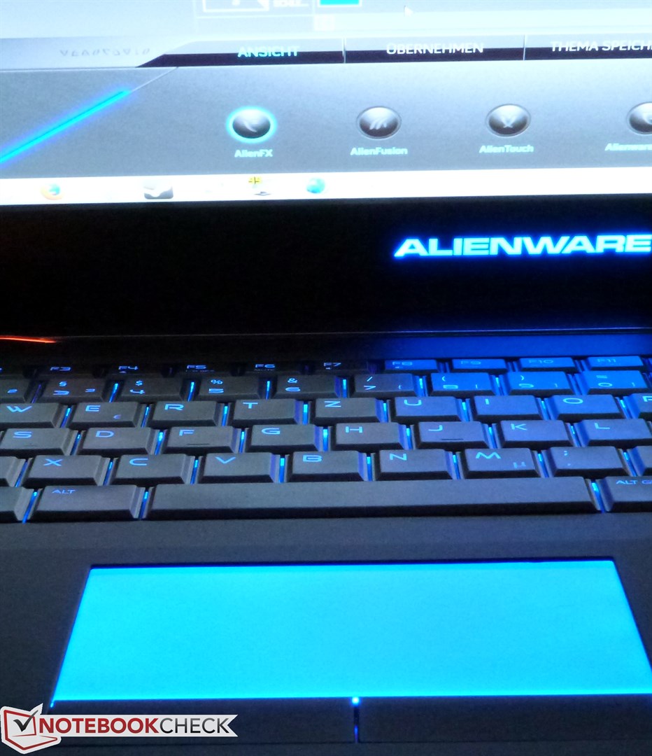 Zudem bietet das Alienware 17 eine gute und kräftige Hintergrundbeleuchtung für die Tastatur. Per Software lassen sich die dargestellten Farben sehr individuell einstellen, selbst extravagante Farbwünsche sind realisierbar. Das Keyboard ist dazu in vier Farbzonen eingeteilt, die sich individuell konfigurieren lassen.