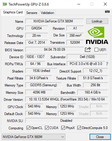 Da die GeForce GTX 980M nun schon eine Weile auf dem Markt ist, möchten wir uns auf die wichtigsten Fakten konzentrieren. Wie seine anderen Geschwister aus der 900-Generation basiert das DirectX-12-Modell auf der Maxwell Architektur und wird im 28-nm-Prozess hergestellt (14 nm @CPU). Mit 1.536 Shader-Einheiten rangiert die GTX 980M etwas über der ebenfalls häufig in Gaming Notebooks verbauten GeForce GTX 970M, die 1.280 Shader enthält. An die Leistung des neuen Spitzenreiters GTX 980 kann der Chip nicht heranreichen. Letztere ist analog zum Desktop-Bruder mit 2.048 Shadern bestückt. Die Taktraten der GTX 980M belaufen sich auf 1.038 bis 1.127 MHz für den Kern und 2.500 MHz für den GDDR5-Speicher.