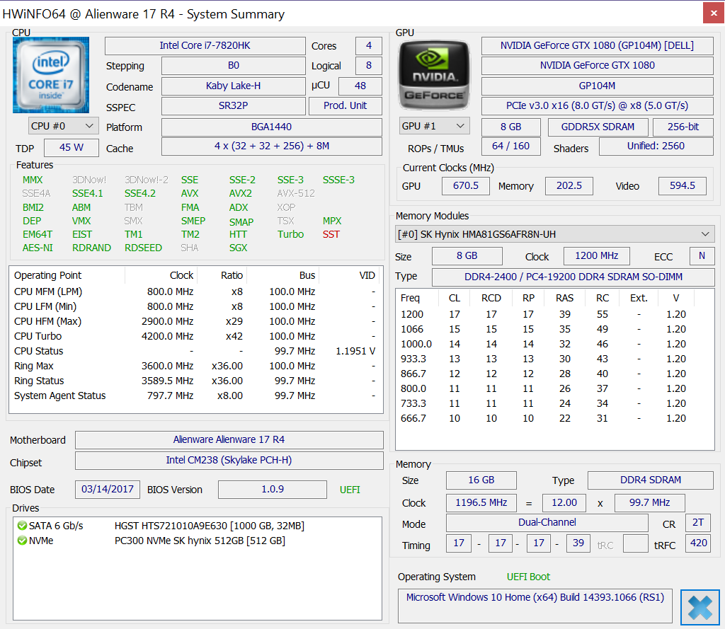 | Alienware 17 R4 GeForce GTX 1080 Mobile, i7-7820HK, SK Hynix PC300 NVMe 512 GB | Alienware 17 R3 (A17-9935) GeForce GTX 980M, 6700HQ, Samsung PM951 NVMe 512 GB | MSI GT72VR 7RE-433 GeForce GTX 1070 Mobile, i7-7700HQ, Kingston RBU-SNS8152S3256GG5 | MSI GT73VR 7RF-296 GeForce GTX 1080 Mobile, i7-7820HK, 2x Samsung SM951 MZVPV256HDGL (RAID 0) | Acer Predator 17 X GX-792-76DL GeForce GTX 1080 Mobile, i7-7820HK, Toshiba NVMe THNSN5512GPU7 | Aorus X7 DT v6 GeForce GTX 1080 Mobile, 6820HK, Samsung SM951 MZVPV512HDGL m.2 PCI-e | |