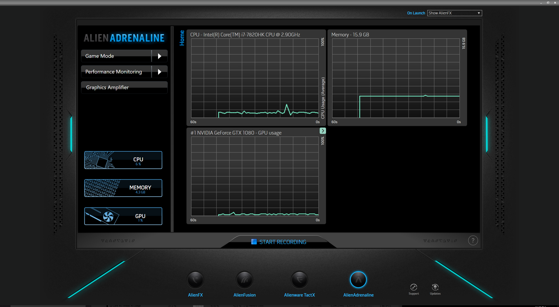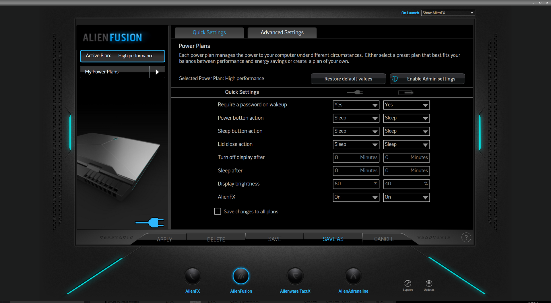 AlienFX ist das Kontrollzentrum für die Makrotasten, die Tastaturbeleuchtung, die Systemüberwachung sowie verschiedene Leistungsprofile. Insgesamt stehen neun Makrotasten zur Verfügung, von denen fünf dreifach belegt werden können. Die Überwachungsfunktionen sind jedoch sehr eingeschränkt und können auch nicht verkleinert dargestellt werden. Hoffentlich werden Einstellungen für die Lüftersteuerung noch mit Updates nachgereicht.