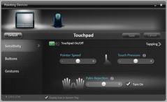 Auch das kleine Touchpad (10 x 5,5 cm) des neuen Alienware entspricht mit den guten Gleiteigenschaften weitestgehend dem Vorgänger 17 R3. Die Oberfläche ist fest und lässt sich nicht eindrücken. Eine größere Oberfläche wäre gut gewesen, doch die kleine Fläche war vermutlich nötig, um die Stabilität nicht zu beeinflussen. Für Einstellungen steht der Synaptics Treiber mit einem speziellen Alienware Design bereit. Gesten werden mit bis zu vier Fingern unterstützt.