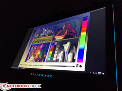 Die Farbraumabdeckung liegt bei 54 % AdobeRGB bzw. 82 % sRGB, womit das Alienware auf dem Niveau des Acer Predator 17 X und dem alten Alienware 17 R3 liegt. Insgesamt sind das durchschnittliche Ergebnisse für einen High-End-Gaming-Laptop. Einige Konkurrenten wie das MSI GT73VR oder das Razer Blade Pro decken sRGB vollständig ab, bieten dafür aber auch keine Panels mit QHD/120Hz/G-Sync. Beim Spielen sind die Reaktionszeiten aber in der Regel wichtiger als möglichst akkurate Farben.