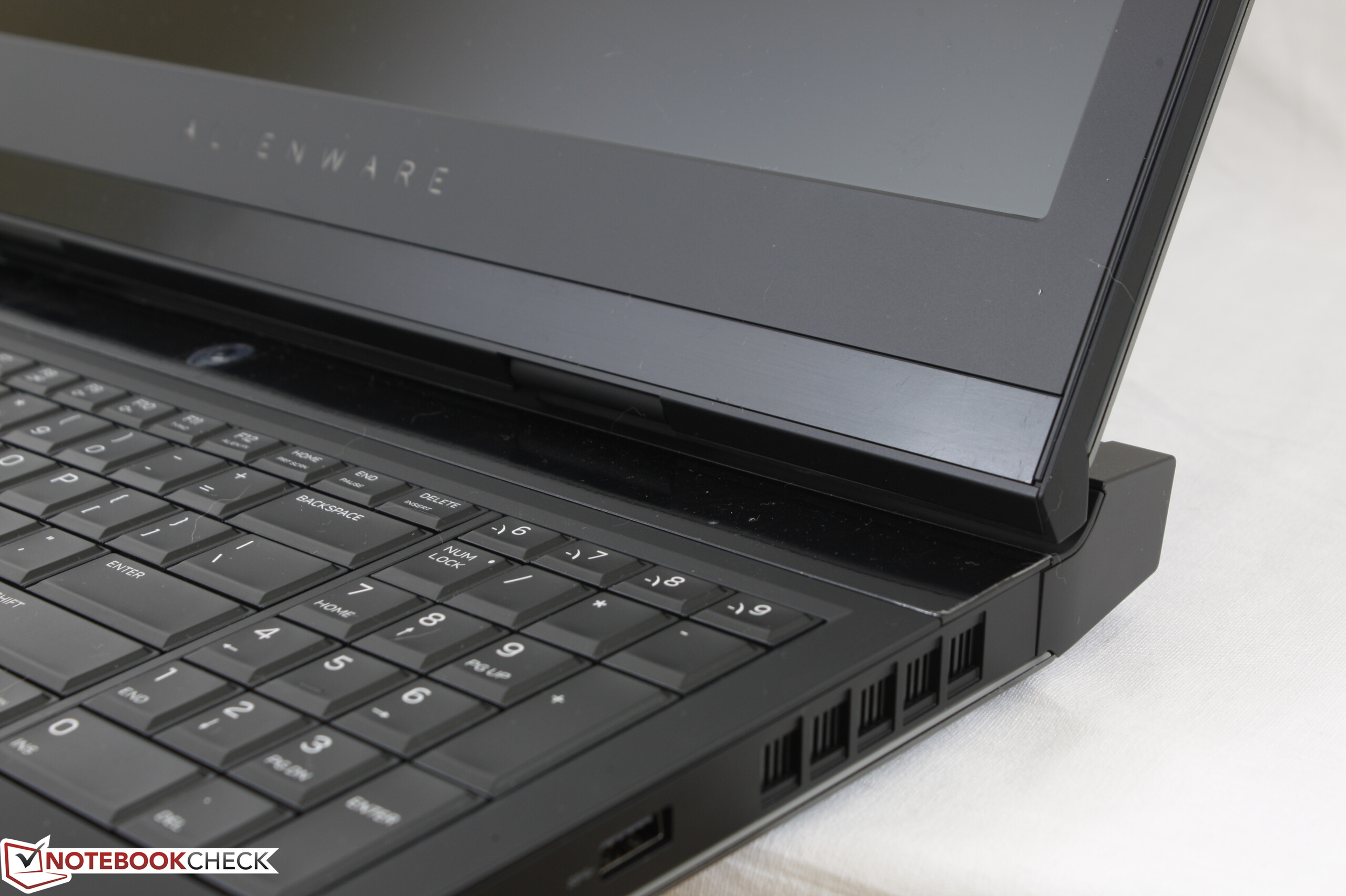 Die Baseunit ist sehr massiv und lässt sich nicht eindrücken, selbst Verwindungsversuche führen nur zu minimalen Knarzgeräuschen. Der Bildschirmdeckel ist an den vorderen Ecken verständlicherweise etwas schwächer, doch insgesamt ist die Stabilität auch hier gut und hinterlässt auch einen besseren Eindruck als bei den Konkurrenten von MSI (GT-Serie) und Asus (ROG-Serie). Ein Problem sind jedoch die Knarzgeräusche, wenn man den Bildschirm öffnet bzw. schließt. Es ist nicht besorgniserregend, doch in dieser Preisklasse sollte das eigentlich kein Problem sein. Ansonsten können wir aber keine überstehenden Kanten oder ungleichmäßigen Spalte erkennen, lediglich der innere Bildschirmrand liegt nicht perfekt auf, weshalb ein wenig Licht von dem beleuchteten Alienware Logo durchscheint. Es ist aber auf keinen Fall so ausgeprägt wie bei dem Testgerät des GT72VR und im Alltag nicht störend.