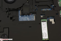 Für das Entfernen der unteren Abdeckung benötigt man nur einen Kreuz-Schraubendreher sowie einen spitzen Gegenstand. Allerdings sitzt die Abdeckung recht fest und lässt sich nicht so leicht entfernen wie bei den meisten Notebooks von Clevo oder MSI. Wenn der Deckel einmal entfernt ist, erhält man Zugang zu allen vier Festplatten-Steckplätzen, dem WLAN-Modul, den Lüftern sowie den beiden DDR4-SODIMM-Steckplätzen. Der Zugang zu dem Akku und dem Mainboard gestaltet sich jedoch schwierig, da die Kernkomponenten unter einer dicken Platte sitzen. Diese hilft zwar der Stabilität, erschwert dafür aber die Wartung.