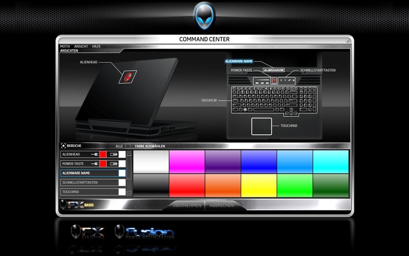 Das Beste kommt allerdings noch: Mittels des Alienware FX Software Tools lassen sich die unterschiedlichen beleuchteten Gehäuseteile getrennt voneinander mit verschiednen Farben belegen. Von einem Zirkusreifen Auftritt in bunten Farben bis hin zu coolem weis-blau ist alles möglich. Für Farb- und Lichtspielverweigerer besteht natürlich auch die Möglichkeit, einzelne Effekte zu deaktivieren oder beispielsweise von vornherein auf die beleuchtbare Tastatur zu verzichten, wobei man sagen muss, dass speziell diese im Gaming Einsatz in abgedunkelten Räumen wirklich gute Dienste leistet.