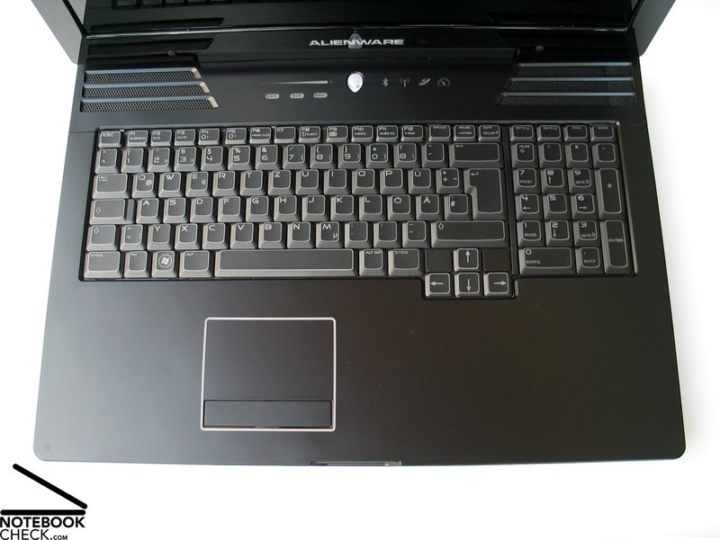Aufgrund der deutlich größeren Gehäuseabmessungen des 17“ Chassis kommt der Benutzer beim Alienware m17x auch in den Genuss eines zusätzlichen Nummernblocks. Das Standard-Tastenfeld zeigt eine Tastengröße von 18x18 Millimetern und ist damit ident zu jenem im m15x. Auch wenn die effektive Auflagefläche der einzelnen Tasten mit 1.4x1.3 Zentimetern deutlich kleiner Ausfällt, lässt sich die Tastatur grundsätzlich überaus angenehm bedienen.