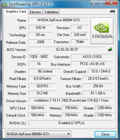 Mit deaktivierter SLI Option, sprich einer einzelnen Geforce 8800M GTX Grafikkarte konnte bei high details noch etwa eine Leistung erbracht werden wie im SLI Modus bei very high details. Mit rund 20 Fps war ein spielen bei very high details bei deaktivierter SLI Option kaum mehr möglich.