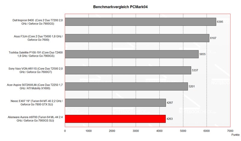 Unter den von uns getesteten Notebooks ist das Aurora m9700 zwar nicht das Leistungsstärkste, diese Rolle gebührt nach wie vor, wenn auch nur knapp dem Nexoc E407 (Turion 64 MT-40 2,2 GHz / Geforce Go 7800 GTX SLI) wobei es sich hier aber um ein 19“ Gerät handelt. Unter den 17 Zöllnern bleibt das Aurora praktisch ohne Konkurrenz.