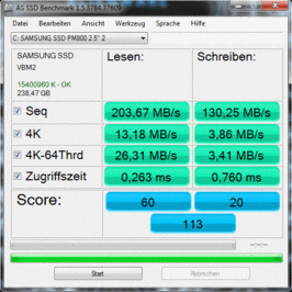 Die Performance der 256 GByte großen SSD (Samsung PM800 2) ermittelten wir mit dem CrystalDiskMark sowie dem AS SSD Benchmark. Beide Tools bescheinigen der Festplatte eine gute Performance. Sowohl die sequentielle Leserate von 199 – 204 MB/Sek, als auch die sequentielle Schreibrate von 130 – 164 MB/Sek ist einer konventionellen HDD spürbar überlegen. Einzig bei kleineren Dateien ist die SSD verhältnismäßig lahm und reiht sich deutlich hinter Intel´s X25-M G2 (z.B. im mySN MG7.c) ein.