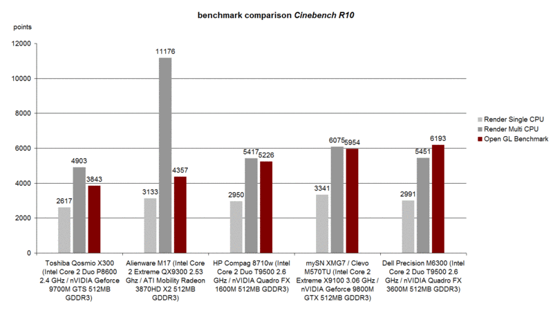 Wenn auch nicht unbedingt ein Heimspiel für das Alienware M17, so sorgen doch auch die Cinebench R10 Benchmarkergebnisse für Aufsehen. Weniger liegt es hier an der Grafik denn an der leistungstarken Quad-Core CPU, die am Multi-Core optimierten Rendering Test Dual-Core Prozessoren praktisch links liegen lässt.