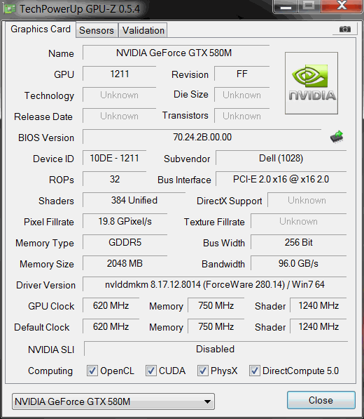 Die GeForce GTX 580M im Alienware M17x wird mit der Referenztaktrate von 620MHz getaktet und bietet 2 GB GDDR5 an dedizierten Grafikspeicher. Detailinformationen zur Architektur der GTX 580M finden Sie auf unserer Grafikkartendetailseite der GeForce GTX 580M.
