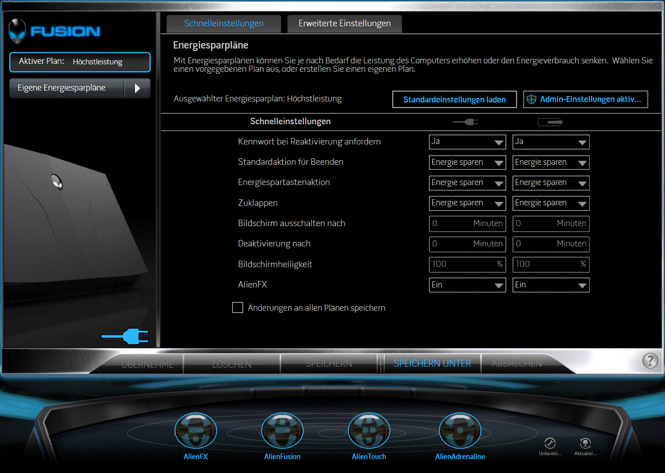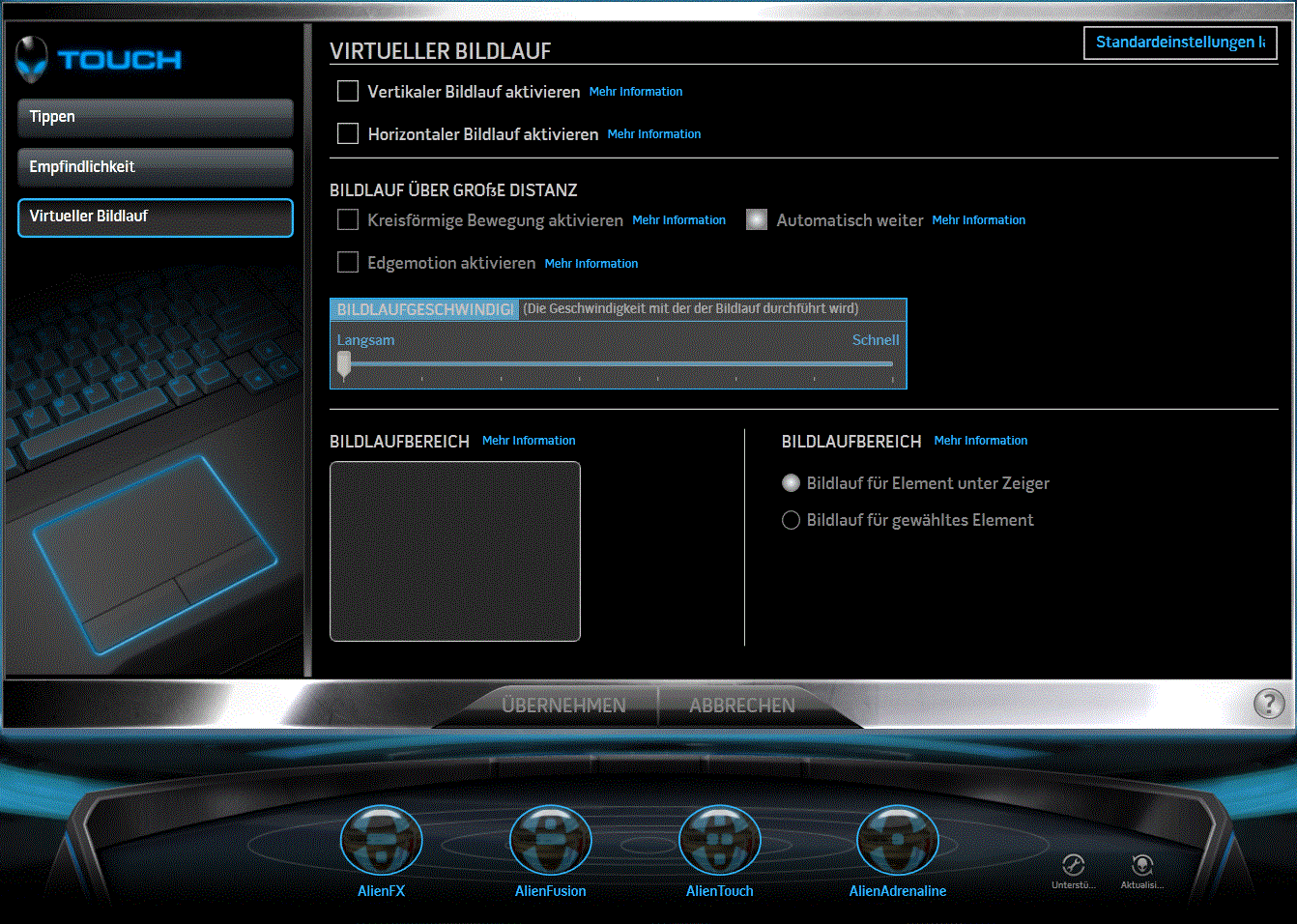 Obwohl der Hersteller diverse Programme und Tools installiert, fühlt sich das Notebook im Auslieferungszustand keineswegs träge an. Zu den Highlights gehören unter anderem der Mediaplayer PowerDVD 9.6 und das sogenannte Command Center. Während AlienFX für die Beleuchtung verantwortlich zeichnet und AlienFusion für ein Energiemanagement steht, lässt sich per AlienTouch das Touchpad konfigurieren (siehe Bilder).