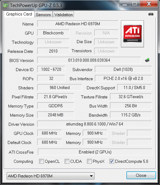 Nach der GeForce GTX 485M SLI ist die Radeon HD 6970M CF die momentan schnellste Dual-GPU-Konstellation. AMDs DirectX 11 fähiges Spitzenmodell hört auf den Codenamen „Blackcomb XT“, wird im aktuellen 40 nm Prozess gefertigt und verfügt über 960 Unified Shader. Während der Kern mit 680 MHz läuft, taktet der 2048 MByte große GDDR5-Videospeicher mit 900 MHz. Das Speicherinterface ist ausreichend dimensioniert, 256 Bit werden so gut wie nie ausgereizt.