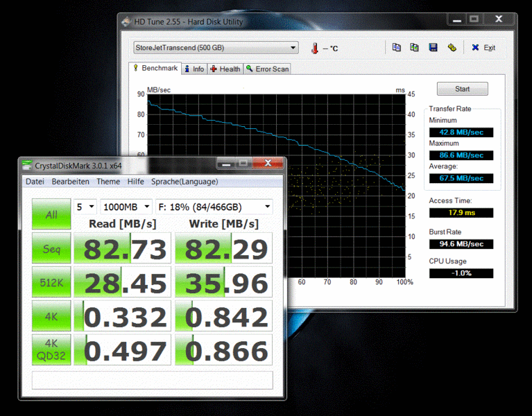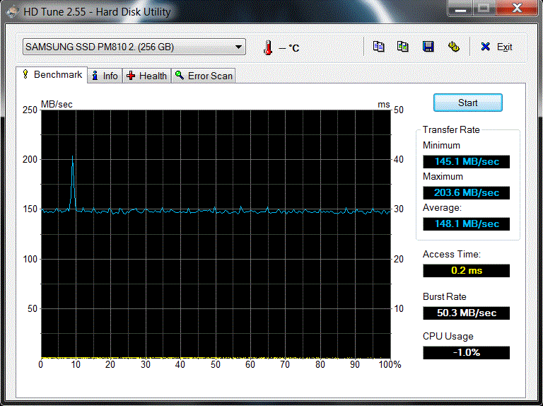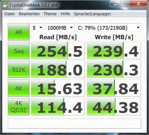 Unser Testgerät enthielt die Samsung PM810, eine 256 GByte große Solid State Drive. Der AS SSD Benchmark attestierte der Festplatte eine ausgezeichnete Performance, über eine sequentielle Leserate von 253.95 MB/Sek und eine sequentielle Schreibrate von 246.22 MB/Sek können normale HDDs nur träumen. Die Zugriffszeit bewegt sich SSD-typisch unter 0.5 ms (HDDs rund 20 ms).