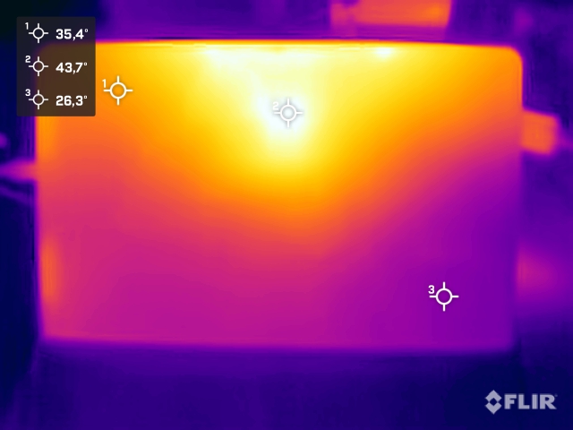 (-) Auf der Unterseite messen wir eine maximalen Wert von 46.3 °C (im Vergleich zum Durchschnitt von 36.8 °C).