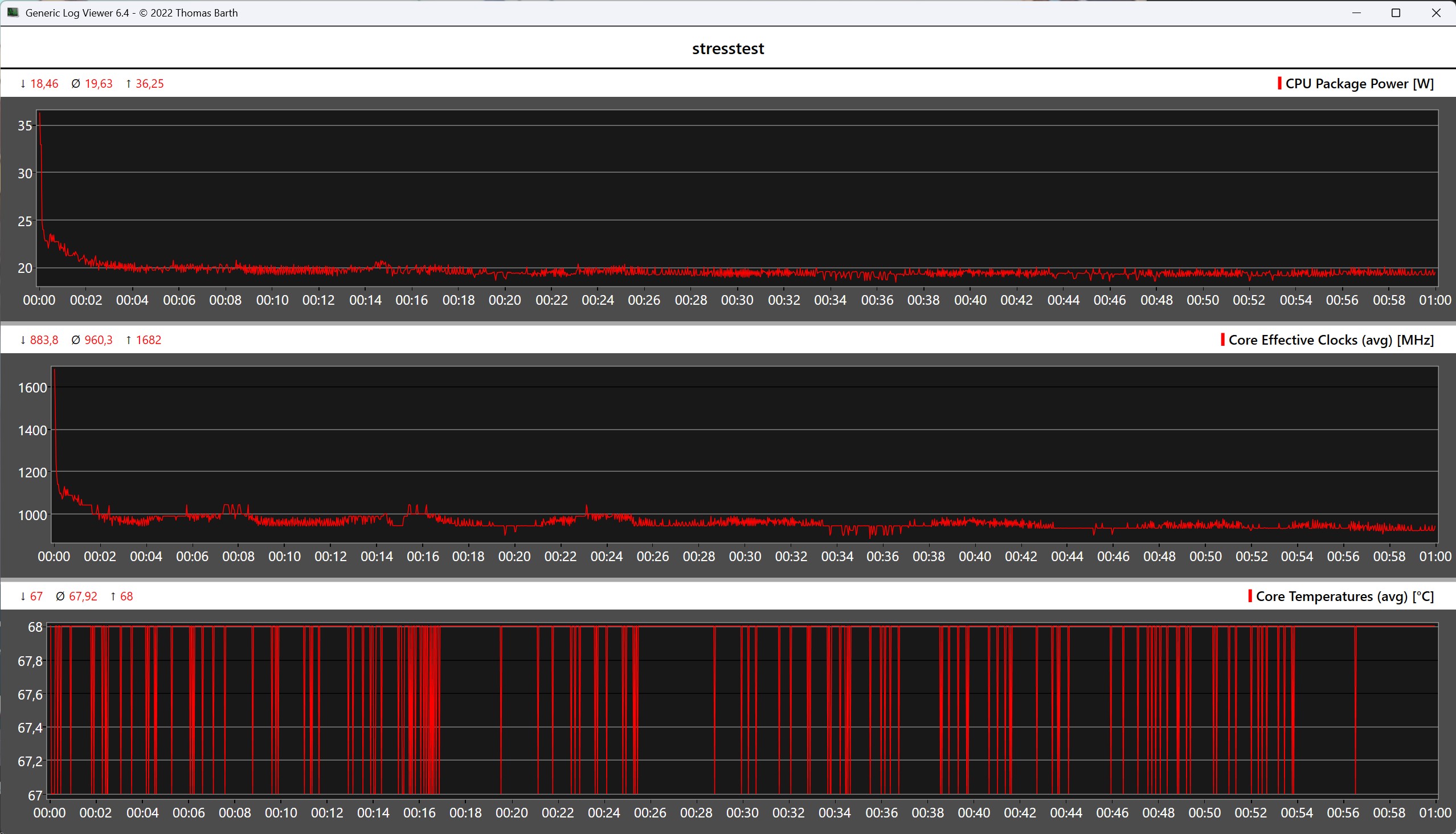 Die Oberflächentemperaturen des iWork GT Ultra bleiben insgesamt unkritisch. Unter voller Last messen wir maximal rund 46 °C auf der Rückseite, was zwar spürbar ist, im Alltag jedoch nicht störend wirkt. Im Stresstest mit kombinierter CPU- und GPU-Auslastung erreicht der SoC kurzzeitig eine Leistungsaufnahme von etwa 36 Watt, bevor er sich zügig bei rund 19 Watt einpendelt.