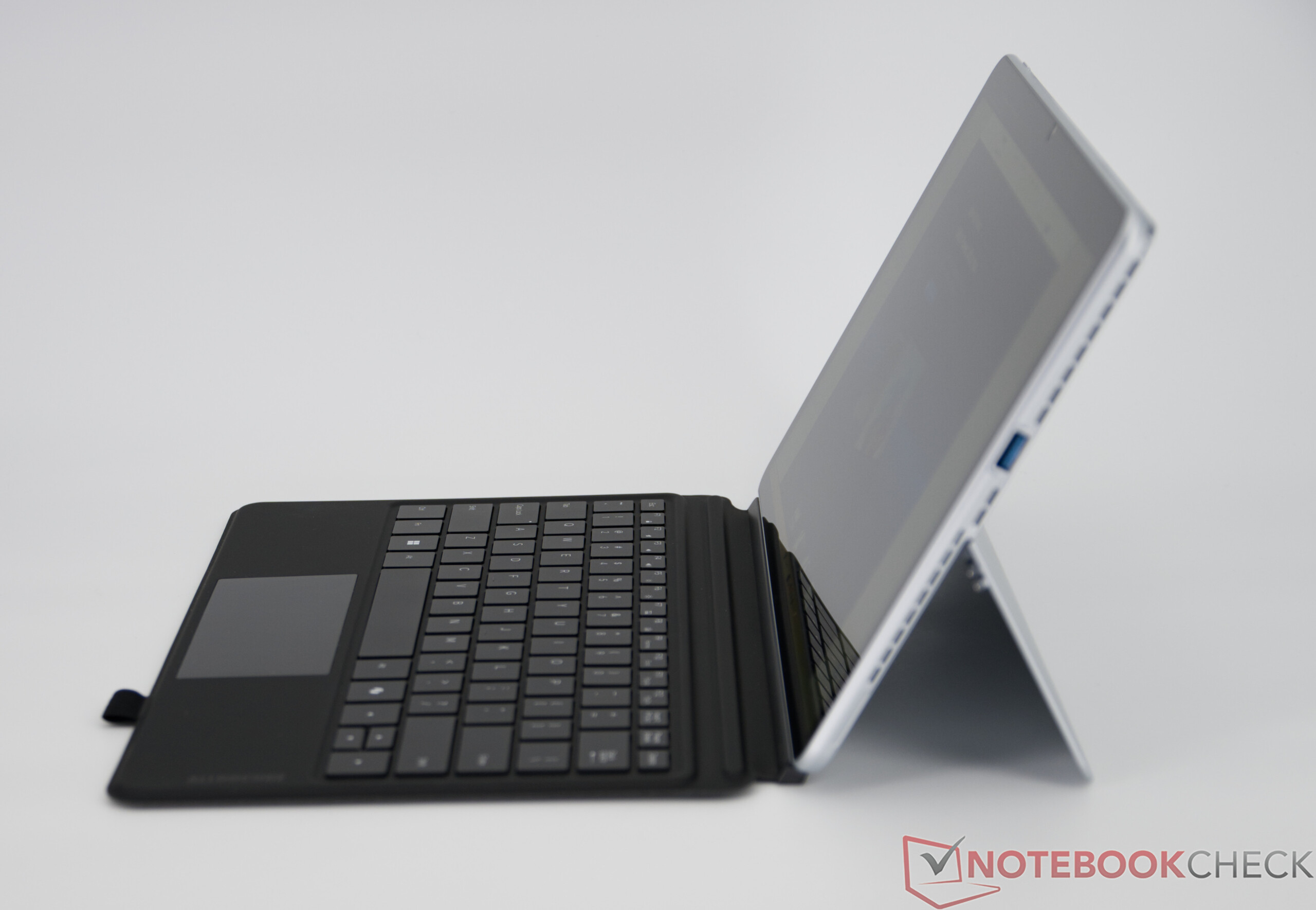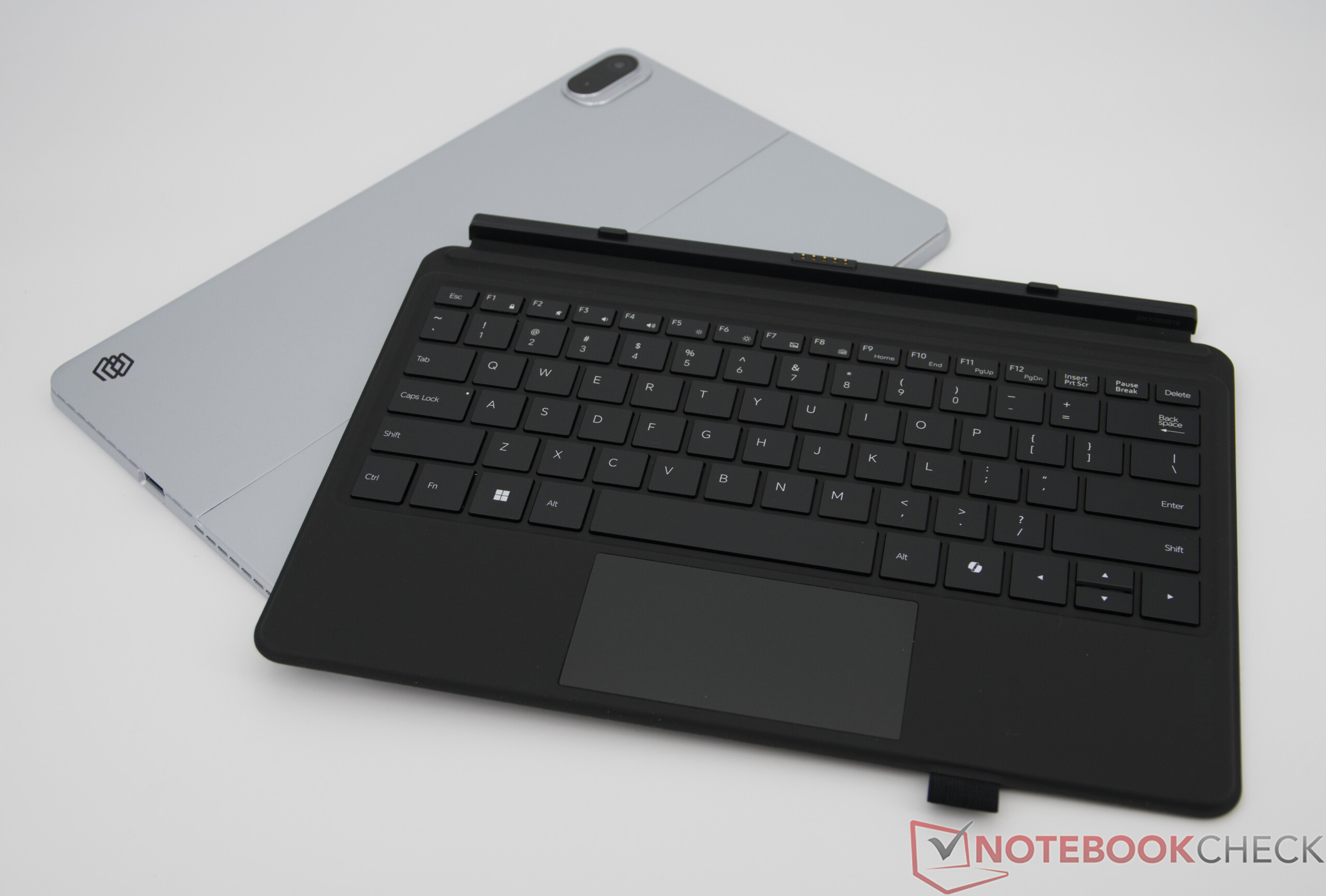 Das optionale Tastaturcover verfügt über eine Hintergrundbeleuchtung, wobei der Tastenhub eher flach ausfällt und die Eingaben etwas lauter ausfallen. Insgesamt ist das Tippgefühl dennoch solide und klar angenehmer als auf einer Bildschirmtastatur. Zu beachten ist allerdings, dass nur ein englisches Layout verfügbar ist. Positiv fällt die weiße Beleuchtung auf, die das Arbeiten bei schlechten Lichtverhältnissen erleichtert. Das integrierte ClickPad fällt recht klein aus, erfüllt im Alltag aber seinen Zweck.