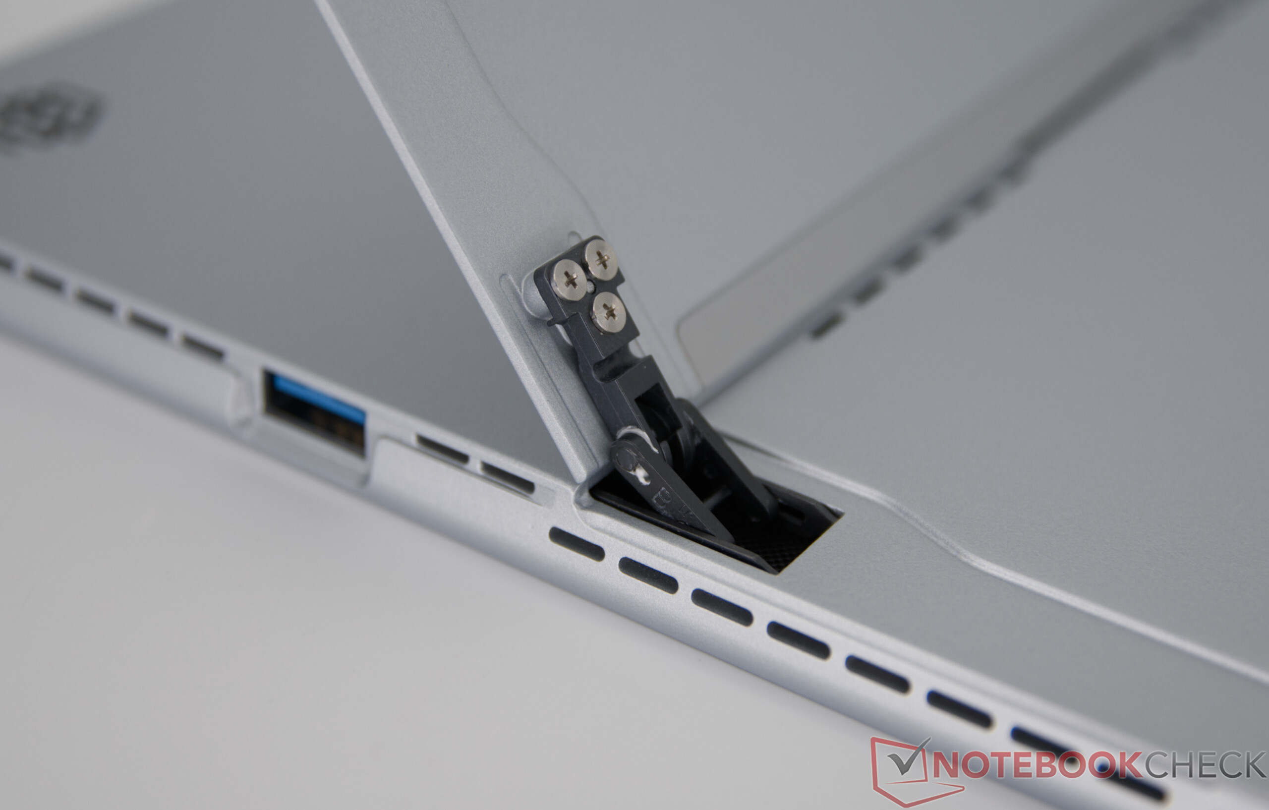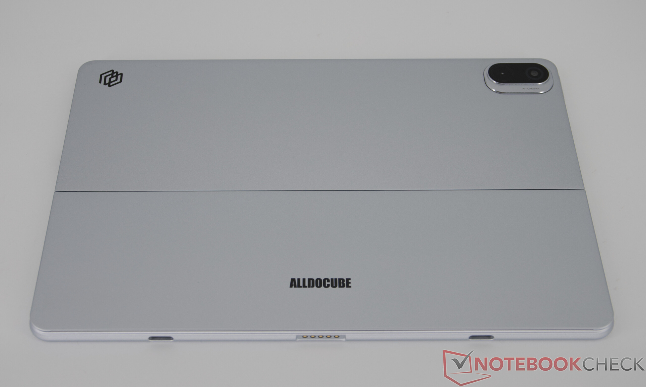 Das iWork GT Ultra kommt mit einem integrierten Kickstand daher. Alldocube setzt auf ein Metallgehäuse das insgesamt einen hochwertigen Eindruck vermittelt. Unter stärkerem Druck zeigt sich jedoch eine gewisse Flexibilität: Leichte Knarzgeräusche beim Verdrehen sowie ein minimal nachgebender Bildschirm sind feststellbar, wirken sich im Alltag aber nicht negativ aus – auch bei normalen Touch-Eingaben bleibt alles stabil. Der aufklappbare Standfuß auf der Rückseite ist stabil und erinnert an ein Microsoft-Tablet.