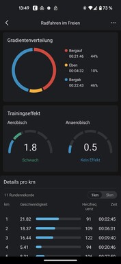 Die gesammelten Daten sind umfangreich. So informiert die Uhr über die vergangene Zeit, die zurückgelegte Strecke, die absolvierten Höhenmeter, die Durchschnittsgeschwindigkeit, die maximale Geschwindigkeit, die verbrauchten Kalorien. Außerdem gibt die Smartwatch noch den durchschnittlichen Puls und die Zeiten in verschiedenen Pulszonen an. Zuletzt informiert die Uhr nach dem Training über die Trainingseffekt, aufgeteilt in aerobes und anaerobes Training. Außerdem wird die Trainingsbelastung angegeben.