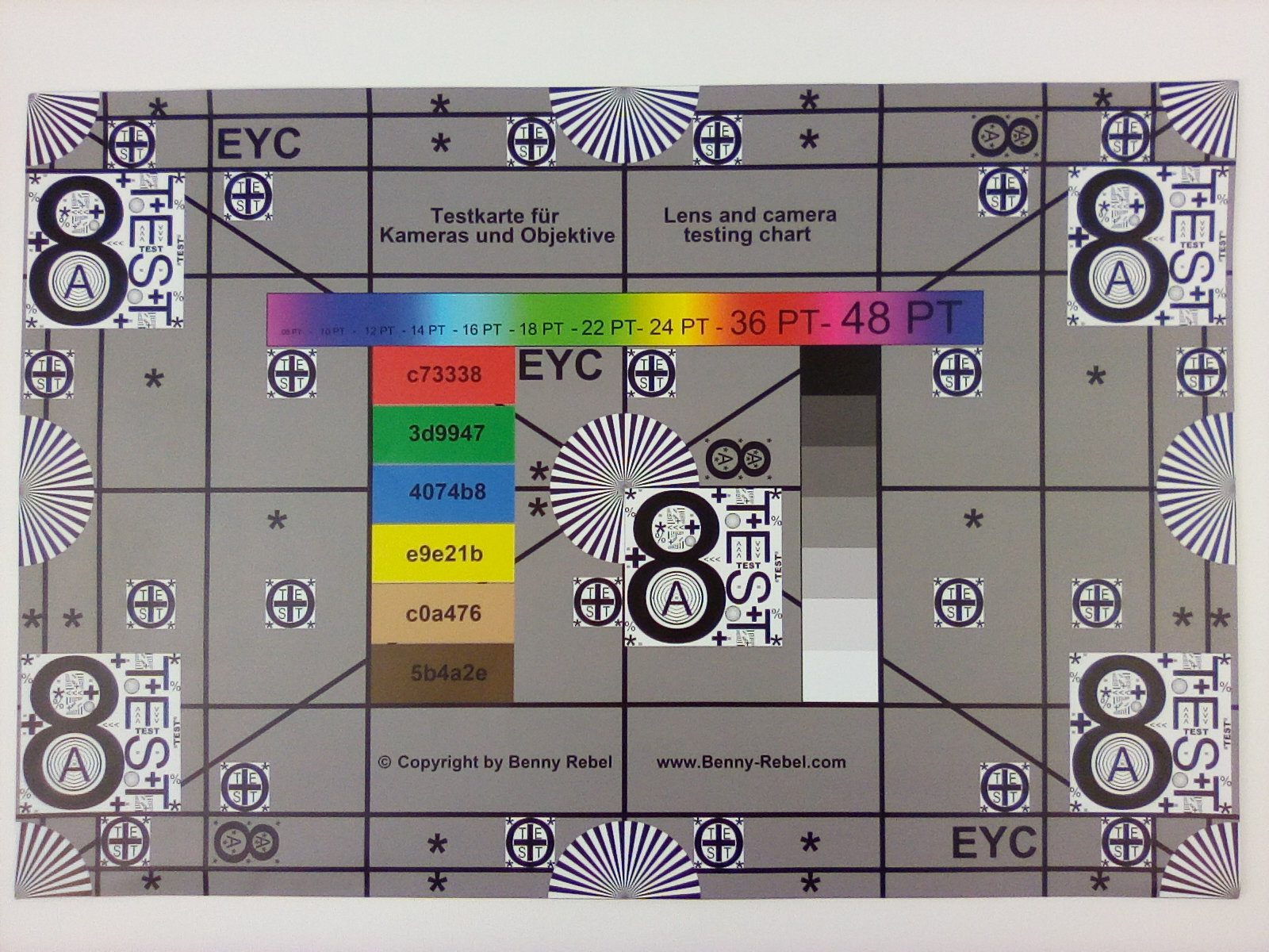 Wie die ColorChecker-Referenzkarte zeigt, betont die Kamera Farben und Graustufen stets eine Spur zu stark, was Aufnahmen nicht unbedingt natürlich, aber ziemlich lebendig wirken lässt. Im Rahmen ihrer Möglichkeiten kann die Kamera auch den Bildschärfe-Testchart recht detailliert ablichten, produziert dabei aber jede Menge Bildrauschen.