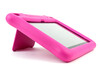 Rein optisch hat sich das Gehäuse des Fire HD 8 gegenüber dem Vorgänger kaum verändert. Das Tablet der Kids Edition ist immer die schwarze Variante. Farbliche Akzente werden durch die bunten Bumperhüllen gesetzt, welche in Blau, Pink und Lila verfügbar sind. Der in dem Bumper integrierte Kunststoff-Standfuß kann nur in einer Position arretiert werden, was jedoch zwei Aufstellpositionen ermöglicht und im Alltag vollkommen ausreicht.