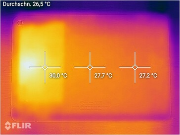 (+) Die maximale Temperatur auf der Oberseite ist 30.4 °C. Im Vergleich liegt der Klassendurchschnitt bei 33.7 °C (von 20.7 bis 53.2 °C für die Klasse Tablet).