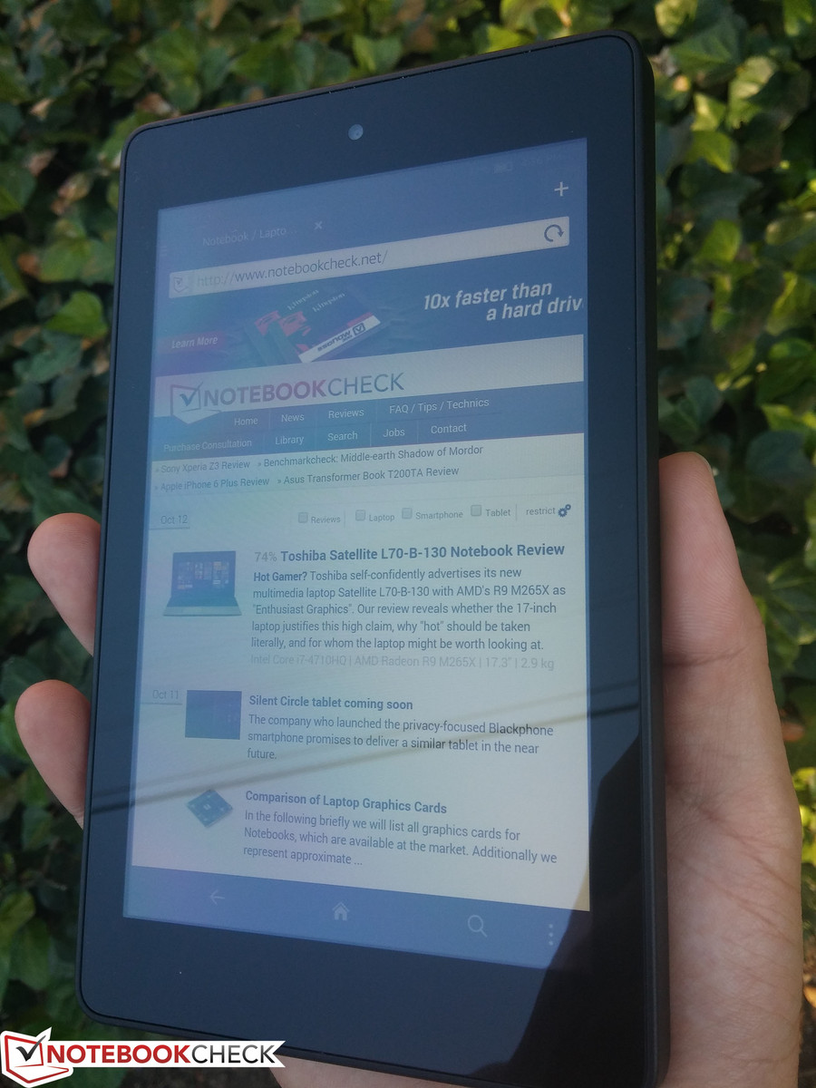 Die Auflösung des Fire HD 6 liegt mit 1.280 x 800 Pixeln auf dem Niveau des etwas größeren Kindle Fire HD 7. Demzufolge übertrifft die Pixeldichte von 252 dpi viele 7-Zoll-Tablets, bei denen die 800p-Auflösung der Standard ist, z. B. beim originalen Google Nexus 7, dem Dell Venue 7 oder dem Asus Fonepad 7. Subjektiv sind Bilder und Texte auf dem Glas-Display sehr scharf, selbst wenn die Inhalte vergrößert werden. Unsere normalen Notebookcheck-Testseiten beispielsweise sind in der Regel sehr textlastig, trotzdem sind die Inhalte gut zu erkennen, ohne dass man die Seite vergrößern muss.