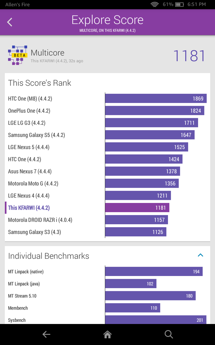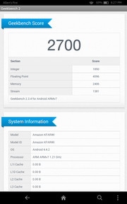 Da es sich beim Fire HD 6 um das erste Modell in unserer Datenbank mit dem MediaTek MTK8135 handelt, haben wir keine Vergleichsgeräte mit dem identischen SoC. Nichtsdestotrotz können wir die Benchmark-Ergebnisse mit anderen Geräten in dieser Größe vergleichen (siehe unten).