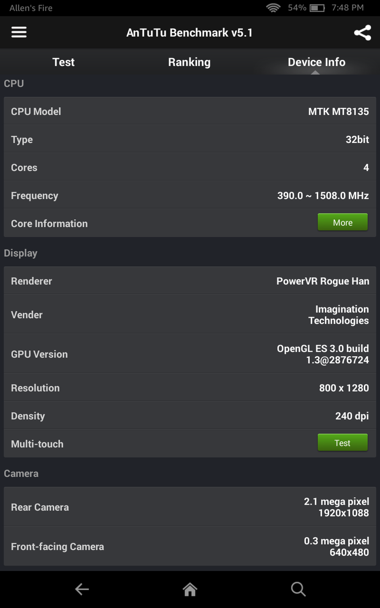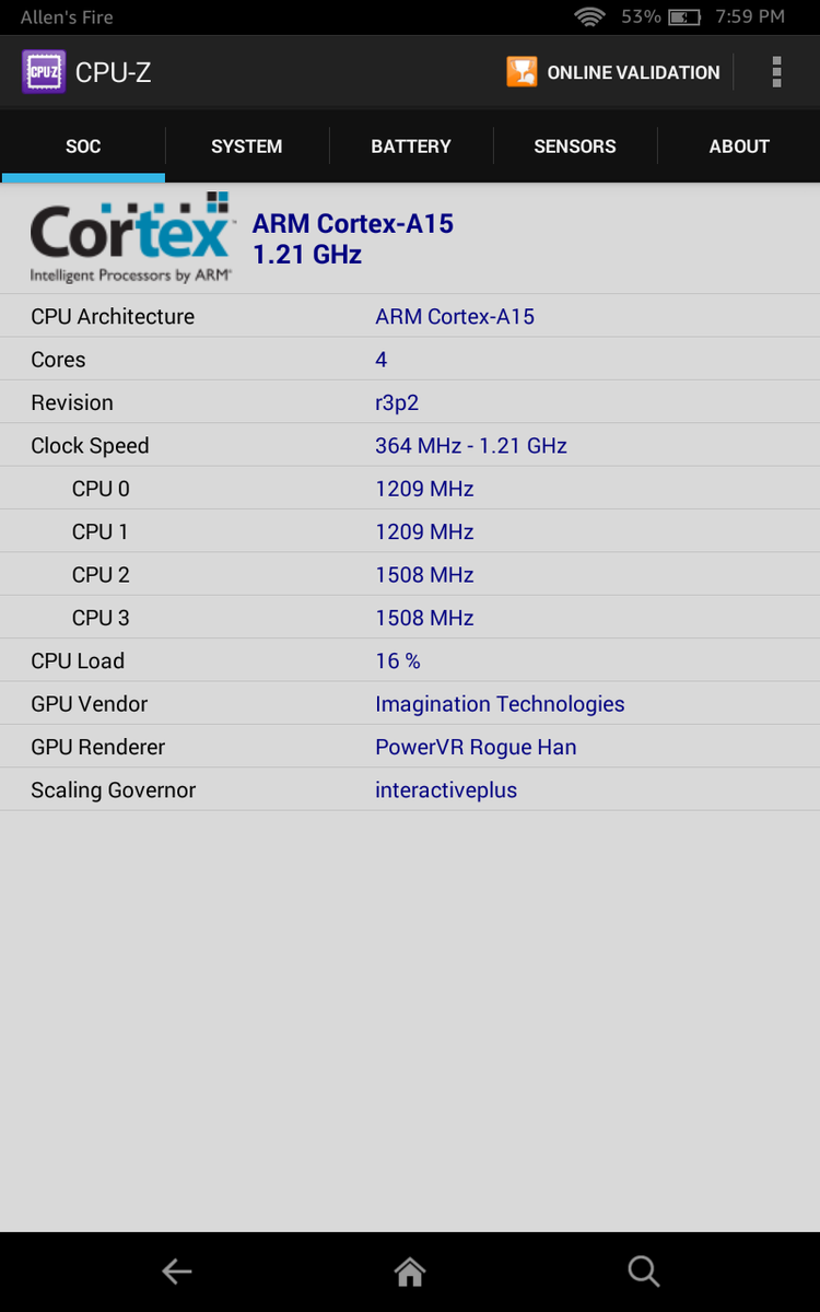 Das 6 Zoll große Amazon-Gerät verwendet einen MediaTek MTK8135 Quad-Core-Prozessor, bei dem zwei Kerne mit 1,5 GHz und zwei Kerne mit 1,2 GHz getaktet sind. Theoretisch kann der Prozessor bis zu 1,7 GHz erreichen, allerdings wird diese Geschwindigkeit beim Kindle Fire 6 laut CPU-Z nicht erreicht, vermutlich um den Energieverbrauch sowie die Wärmeentwicklung zu begrenzen. Der unterschiedliche Takt ist ebenfalls ein Stromsparmechanismus, ähnlich zu Samsungs big.LITTLE-Technologie, die bei den Exynos-SoCs zum Einsatz kommt. Die Größe des Arbeitsspeichers beträgt 1 GB.