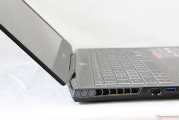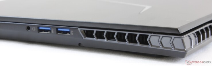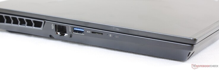 Die Anschlussausstattung hat sich seit der letzten Generation nur geringfügig verändert. Während das Aorus X5 noch über einen vollwertigen SD-Kartenleser und zwei Audioklinkenanschlüsse verfügte, besitzt das Aorus 15 jetzt nur noch einen microSD-Kartenleser und einen 3,5-mm-Klinkenanschluss. Alles andere bleibt beim Alten, einschließlich des fehlenden Thunderbolt-3-Ports. Da die Aorus-Reihe eigentlich für Gigabyte's Gaming-Spitzenmodelle steht, sind wir von der hier fehlenden Thunderbolt-Unterstützung schockiert.