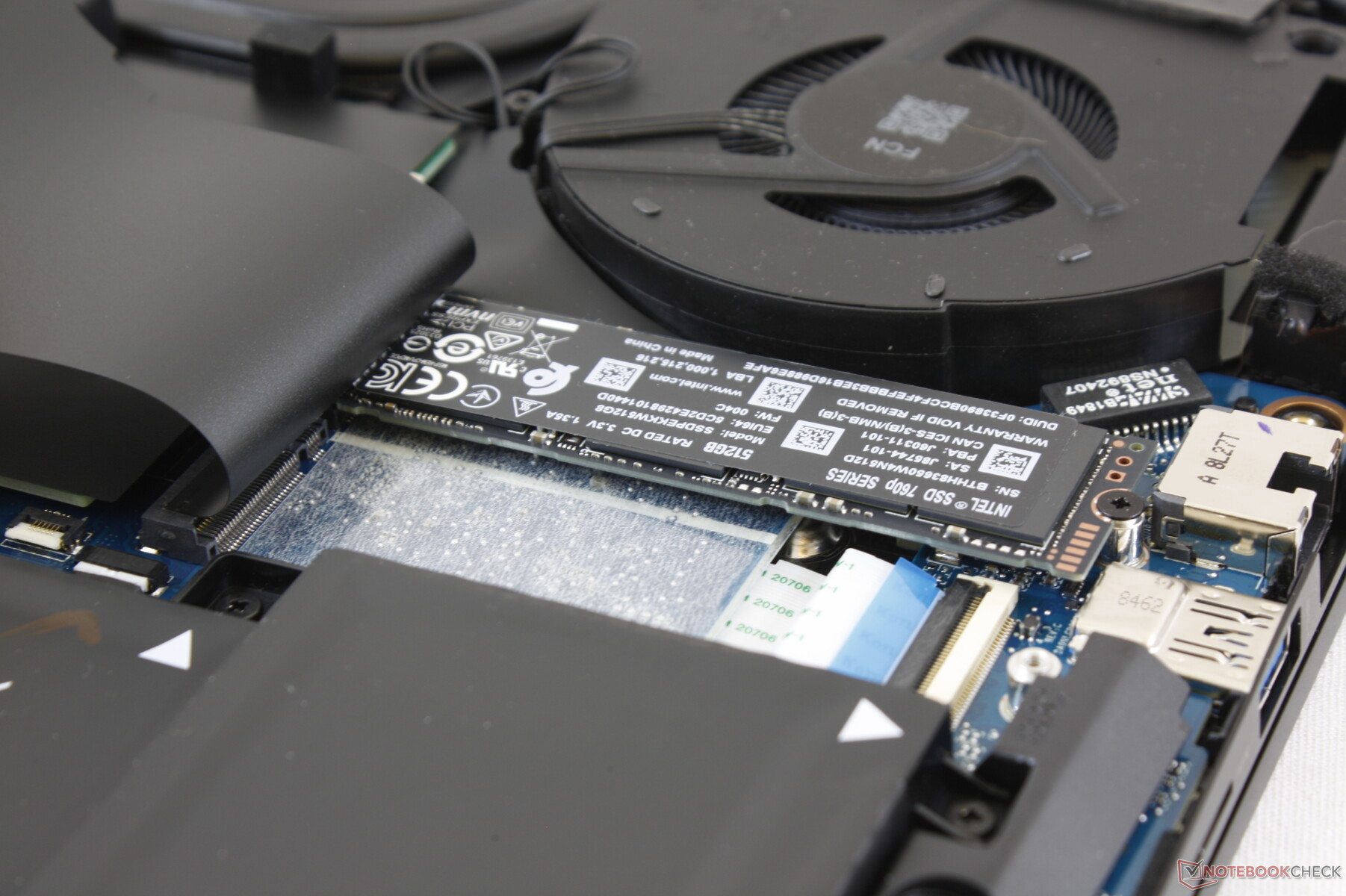 Im Inneren haben Nutzer dann direkten Zugriff auf alle drei Speicherschächte, beide DDR4-SODIMM-Slots (bis zu 32 GB), den Akku und das WLAN-Modul. Achtung: Um die Abdeckung auf der Unterseite zu entfernen, muss zunächst ein Sticker abgelöst werden, was sich wiederum auf die eingeschränkte Garantie auswirken kann.