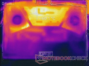 Beim Ausführen von The Witcher 3 können die Tastaturmitte und die Unterseite des Laptops bis zu 40 bzw. 60 °C warm werden. Im Gegensatz zum älteren Aorus X5 ist die Bodenplatte des Aorus 15 großflächig perforiert und legt somit die gesamte Kühllösung frei. Glücklicherweise erreicht jedoch nur die Heatpipe 60 °C und nicht das Gitter selbst. Um den ordnungsgemäßen Betrieb zu ermöglichen, dürfen keine der vielen Belüftungsgitter verdeckt werden.