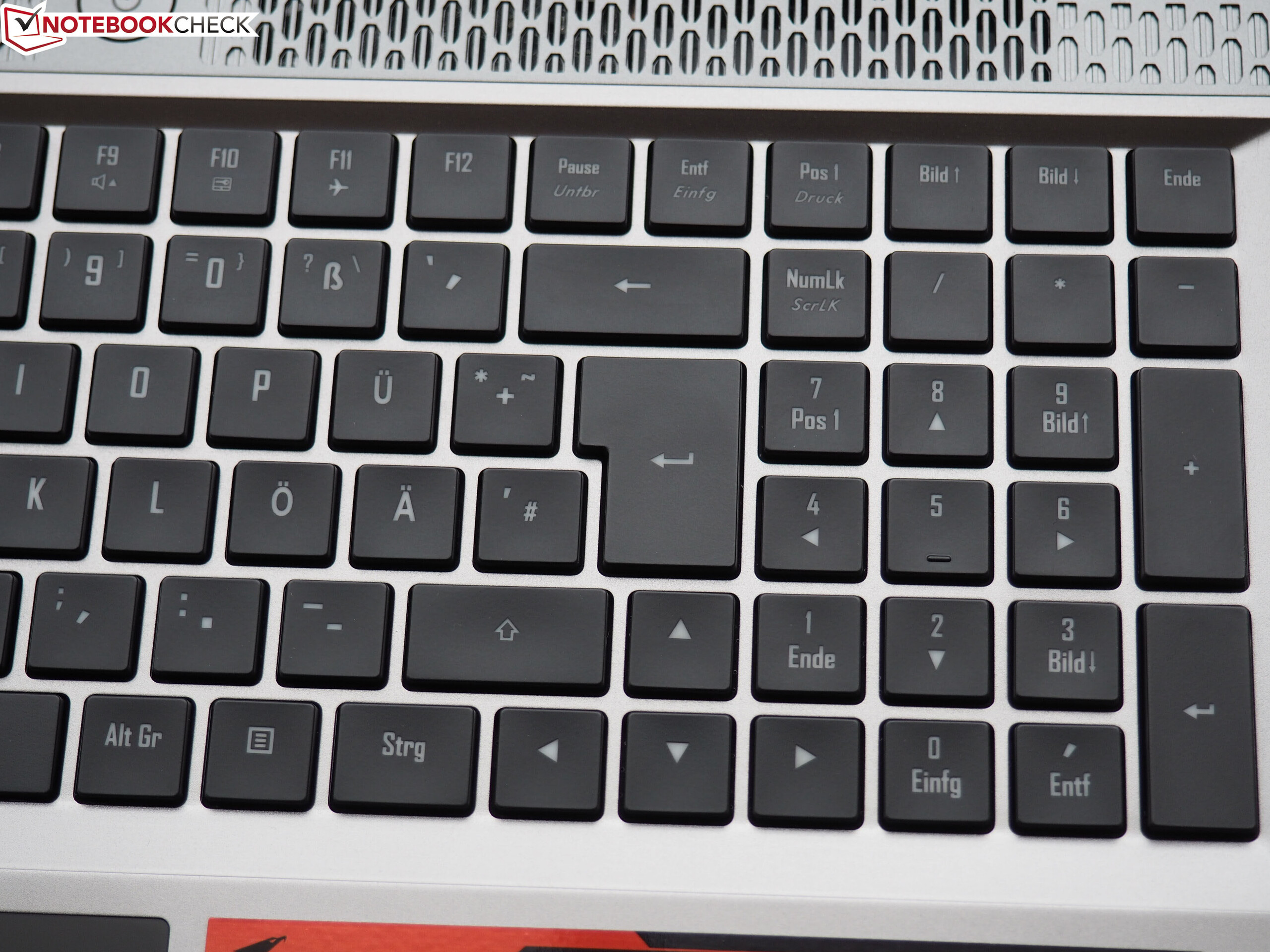 Kurzum: Wir hatten im Test nie das Bedürfnis eine externe Tastatur anzuschließen – das kommt äußerst selten vor. Einzig am Layout könnte Gigabyte noch etwas schrauben. Zwar hält sich die Anordnung größtenteils an den deutschen Standard, dass Entf und Einfg sowie Pos1 und Druck kombiniert sind, halten wir jedoch für keine gute Entscheidung. Dass mechanische Keyboards über ein ziemlich lautes Tippgeräusch verfügen, dürfte derweil bekannt sein.