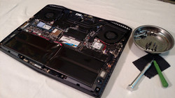 Mit den richtigen Werkzeugen lässt sich das X3 Plus v7 recht leicht auseinandernehmen. Die Rückseite wird von insgesamt 10 Torx-Schrauben (T6) gesichert, wobei die vier vorderen ein wenig kürzer sind. Nachdem die Schrauben entfernt wurden, müssen nur noch einige Kunststoffhaken gelöst werden, bevor man den Deckel abnehmen kann. So erhält man Zugang zum Akku, zwei DDR4-Steckplätzen sowie zwei M.2-Slots (kompatibel mit NVMe-SSDs), dem WLAN-Modul und den Kühlkörpern für die CPU/GPU. Abgesehen von den beiden Kernkomponenten (CPU/GPU) können alle Teile ersetzt bzw. aufgerüstet werden. Es ist zudem recht leicht, die beiden Kühlkörper zu entfernen, wenn man die Wärmeleitpaste erneuern möchte.